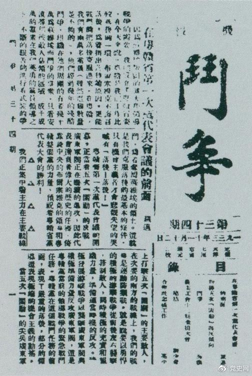 1933年11月5日,劉少奇主持中央蘇區(qū)農(nóng)業(yè)工會(huì)十二縣查田大會(huì),并作總結(jié)報(bào)告。圖為《斗爭》第34期刊登的目錄。
