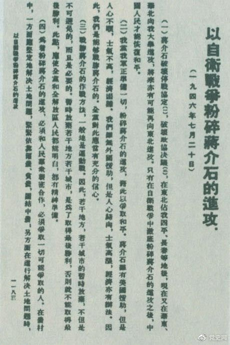 1946年7月20日,中共中央向全黨發(fā)出《以自衛(wèi)戰(zhàn)爭粉碎蔣介石的進攻》的指示,號召全黨全軍樹立打敗蔣介石的信心,并規(guī)定了戰(zhàn)勝敵人的正確方針、原則和方法。圖為當時的報道。